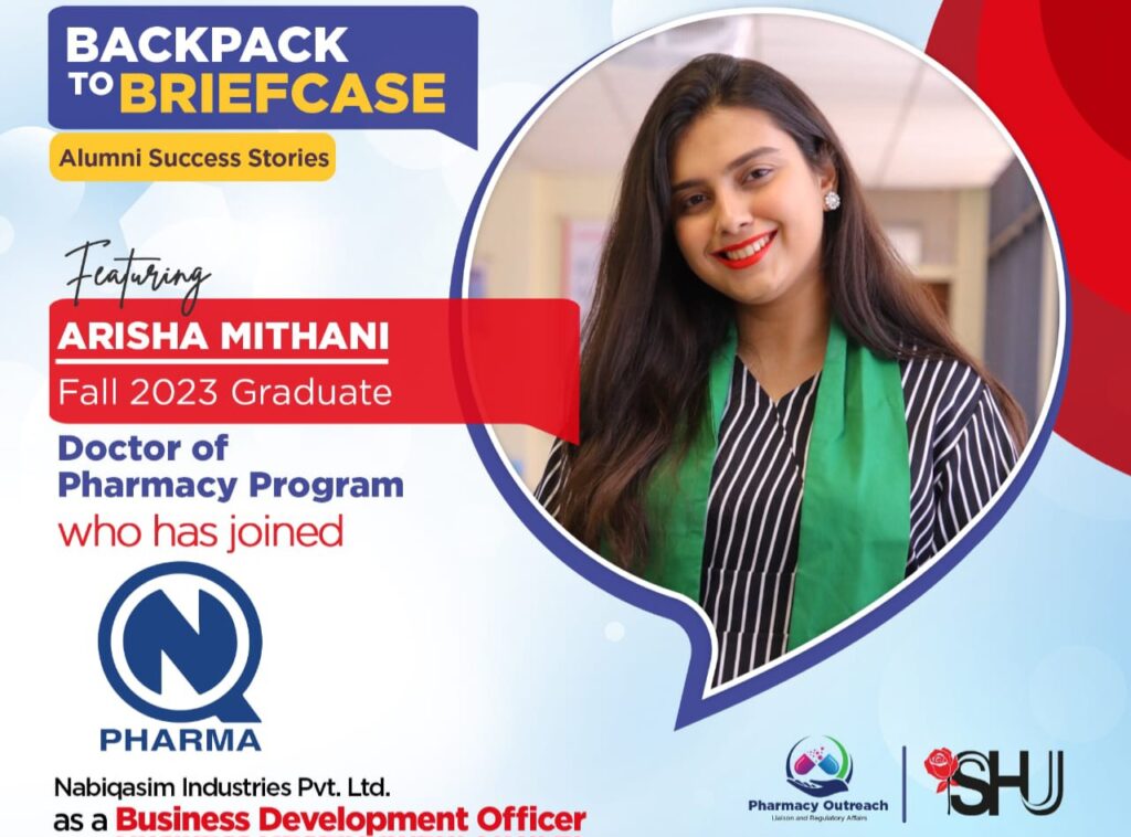The Pharmacy Outreach, Liaison and Regulatory Affairs Office at Salim Habib University is proud to announce that Arisha Mithani, a
