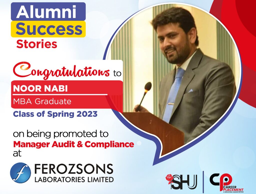 The Career Placement & Industrial Liaison Office at Salim Habib University congratulates Noor Nabi, an MBA Graduate of the Class