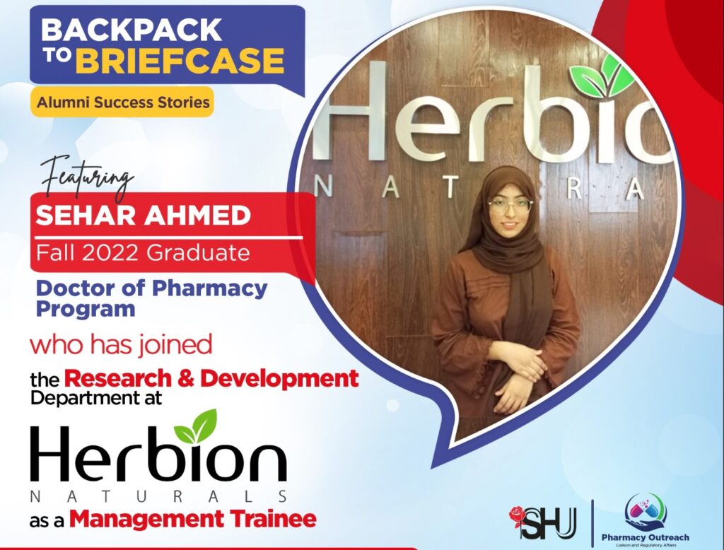 The Pharmacy Outreach, Liaison and Regulatory Affairs Office at Salim Habib University is proud to announce that Sehar Ahmed, a