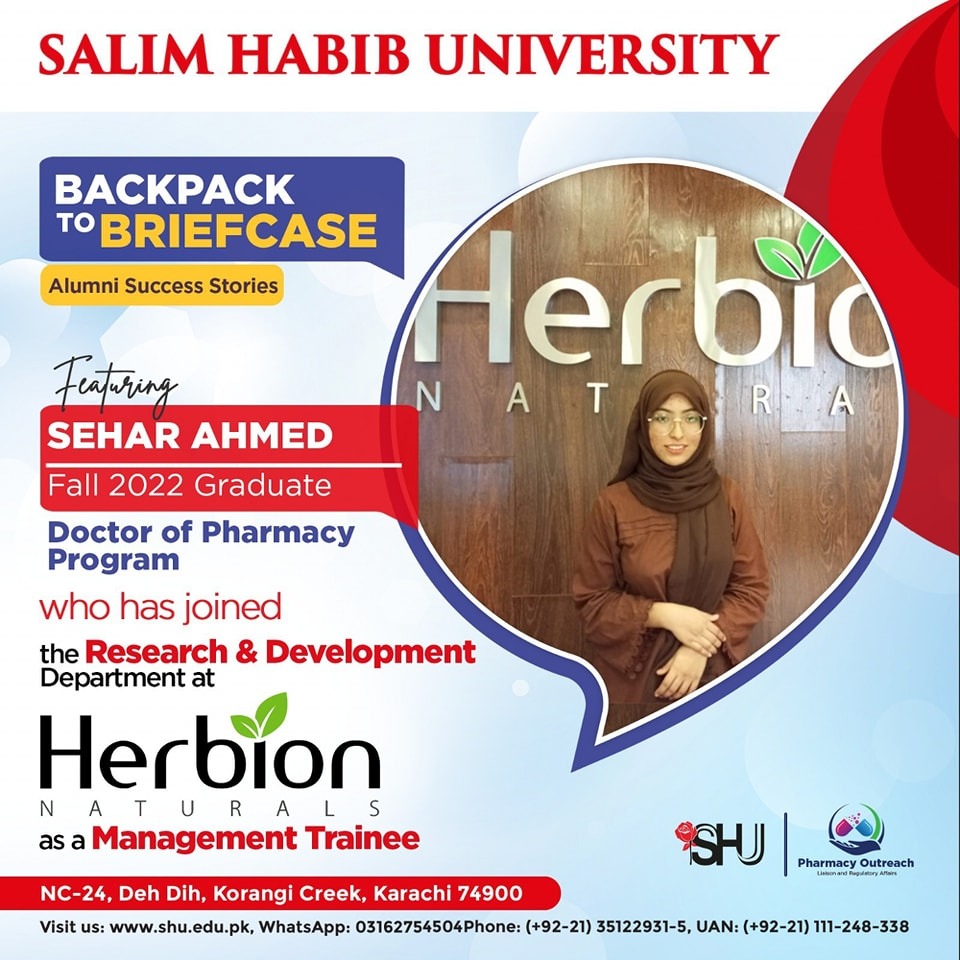 “My years at Salim Habib University were beautiful. The university, its faculty, my fellow students, and my friends made my journey from student life to professional life so smooth. The Doctor of Pharmacy program not only taught me the ins and outs of the field but also gave me the hands-on experience I needed. Thanks to SHU, I was able to successfully secure a job as Management Trainee at Herbion, and I couldn’t be happier about how well-prepared I feel for the real world!”