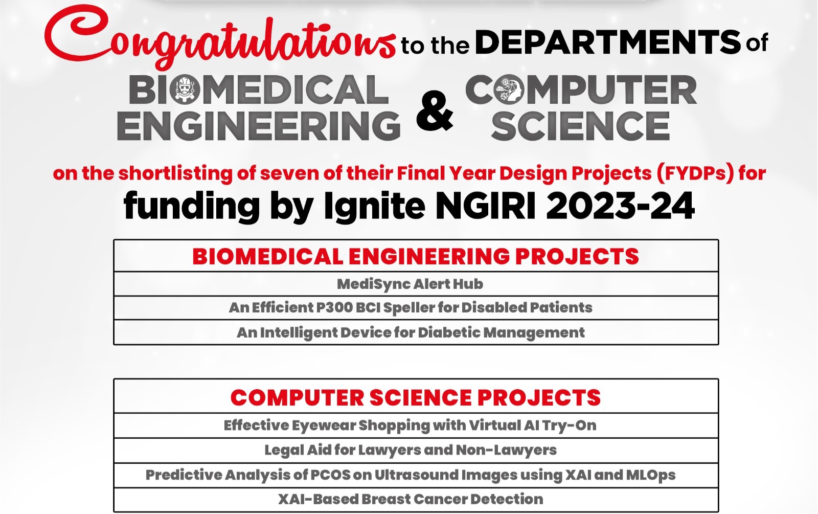 We are proud to announce that Final Year Design Projects developed by talented Biomedical Engineering and Computer Science students from Salim Habib University have been selected for funding by Ignite NGIRI 2023-24.These projects include:BIOMEDICAL ENGINEERING1. MediSync Alert Hub by Nabiha Rehman, Maryiam Ashfaque, and Sharjeel Hassan, supervised by Engr. Gul Munir and Engr. Hassan Ali, Lecturers, Department of Biomedical Engineering2. An Efficient P300 BCI Speller for Disabled Patients, by Amna Jawed Shaikh, Sarah Tariq, and Muzammil Ahmed, supervised by Engr. Muhammad Aamir and Engr. Shaheer Mirza, Lecturers, Department of Biomedical Engineering3. An Intelligent Device for Diabetic Management, by Syed Saim Ahmed, supervised by Prof. Dr. Zeeshan Ul Haque, Dean, Faculty of Engineering, and Engr. Gul Munir, Lecturer, Department of Biomedical EngineeringCOMPUTER SCIENCE1. Effective Eyewear Shopping with Virtual AI Try-On by Alisha Fatima, Muhammad Sufiyan, and Muhammad Taha, supervised by Ms. Saadia Karim, Lecturer, Department of Computer Science2. Legal Aid for Lawyers and Non-Lawyers by Qamar Abbas, Abdul Hanan Khan, and Shahfaiz Baig, supervised by Prof. Dr. Rizwan Ahmed Khan, Dean, Faculty of Information Technology, and co-supervised by Ms. Sidra Nasir, Lecturer, Department of Computer Science 3. Predictive Analysis of PCOS on Ultrasound Images using XAI and MLOps by Aliza Alwani, Dileep Kumar, and Hasaan Abdullah, supervised by Prof. Dr. Rizwan Ahmed Khan, Dean, Faculty of Information Technology, and co-supervised by Ms. Sidra Nasir, Lecturer, Department Computer Science4. XAI-Based Breast Cancer Detection by Fatima Tuz Zahra, Uzma Fatima, and Amber Asif, supervised by Prof. Dr Sheeraz Arif, Chairperson, Department of Computer Science, and co-supervised by Ms. Sumra Khan, Lecturer, Department of Computer Science