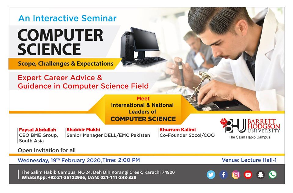 An interactive seminar – Computer ScienceScope, Challenges & ExpectationsExpert Career advice & guidance in computer science fieldOpen invitation for allOn 19th February 2020 at Barrett Hodgson UniversityTimings: 02:00 PM till 04:00 PM