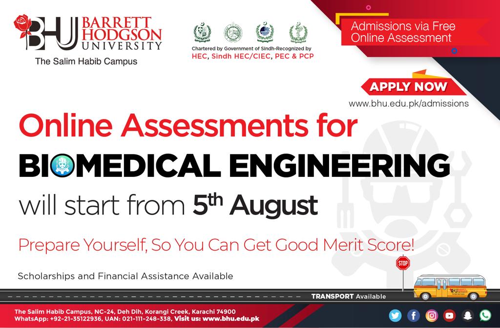 Online Assessments for Biomedical Engineering will start from 5th August.Prepare well to obtain a good merit score.Scholarships and financial assistance available.Apply NOW! https://bit.ly/2ZN2x71WhatsApp: 02135122936
