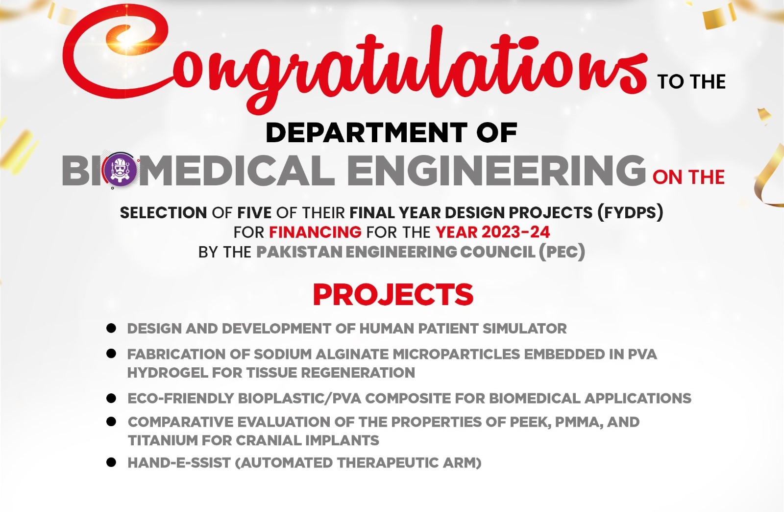 We take immense pride in announcing that five Final Year Design Projects (FYDPs) created by Salim Habib University’s bright Biomedical Engineering students have been selected for financing for the year 2023-2023 by the Pakistan Engineering Council (PEC).The selected projects are:1. Design and Development of Human Patient Simulator, supervised by Prof. Dr. Zeeshan Ul Haque, Dean, Faculty of Engineering, and Engr. Tooba Khan, Lecturer Biomedical Engineering2. Fabrication of Sodium Alginate Microparticles Embedded in PVA Hydrogel for Tissue Regeneration, supervised by Mr. M. Wasim Munir, Assistant Professor Biomedical Engineering, Engr. Tooba Khan, and Engr. Abdul Moiz, Research & Teaching Associate, Biomedical Engineering3. Eco-Friendly Bioplastic/PVA Composite for Biomedical Applications, supervised by Engr. Tooba Khan and Engr. Hassan Ali, Lecturer Biomedical Engineering 4. Comparative Evaluation of the Properties of PEEK, PMMA, and Titanium for Cranial Implants, supervised by Engr. Tooba Khan and Mr. M. Wasim Munir5. Hand-e-Ssist (Automated Therapeutic Arm), supervised by Engr. Hassan Ali and Engr. Tooba KhanCongratulations!