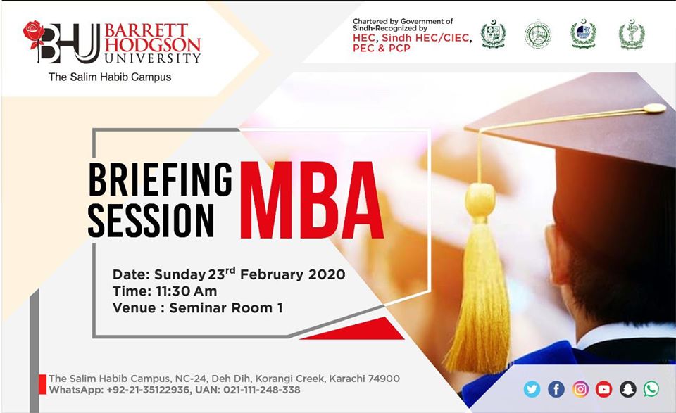 You are invited to a Briefing Session for MBA at Barrett Hodgson University on Sunday 23rd February 2020.Please arrive at Barrett Hodgson University by 11:15 AM