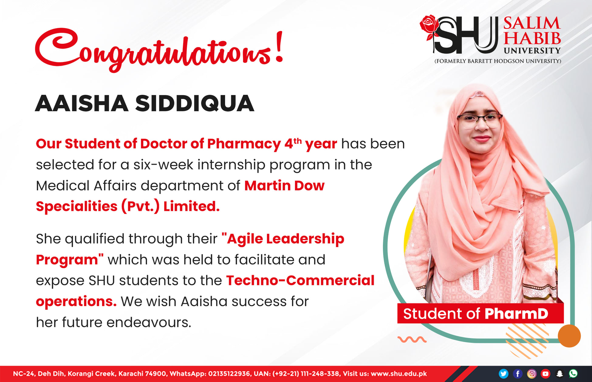Congratulations Aaisha Siddiqua our Student of Doctor of Pharmacy 4th year for being selected for a six-week internship program in the Medical Affairs department of Martin Dow Specialities (Pvt.) Limited.She qualified through their "Agile Leadership Program" which was held to facilitate and expose SHU students to the Techno-Commercial operations. We wish Aaisha success in her future endeavors.