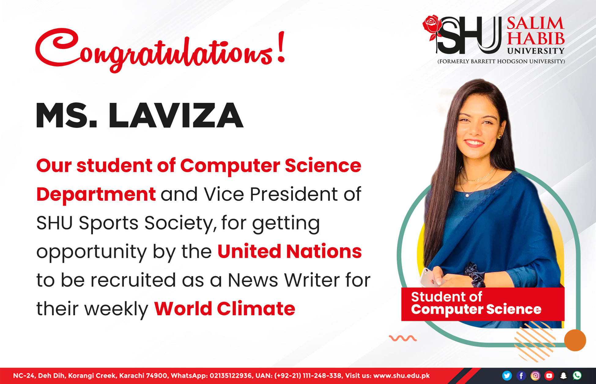 Congratulations Ms. Laviza, our student from the Computer Science Department and Vice President of SHU Sports Society, for getting the opportunity by the United Nations to be recruited as a News Writer for their weekly World Climate Change News. The prime concern of UN Climate Change program is to create awareness about climate change and preventing harmful effects on biodiversity and people around us by taking necessary steps to mitigate the dangers and by adopting the best solution.