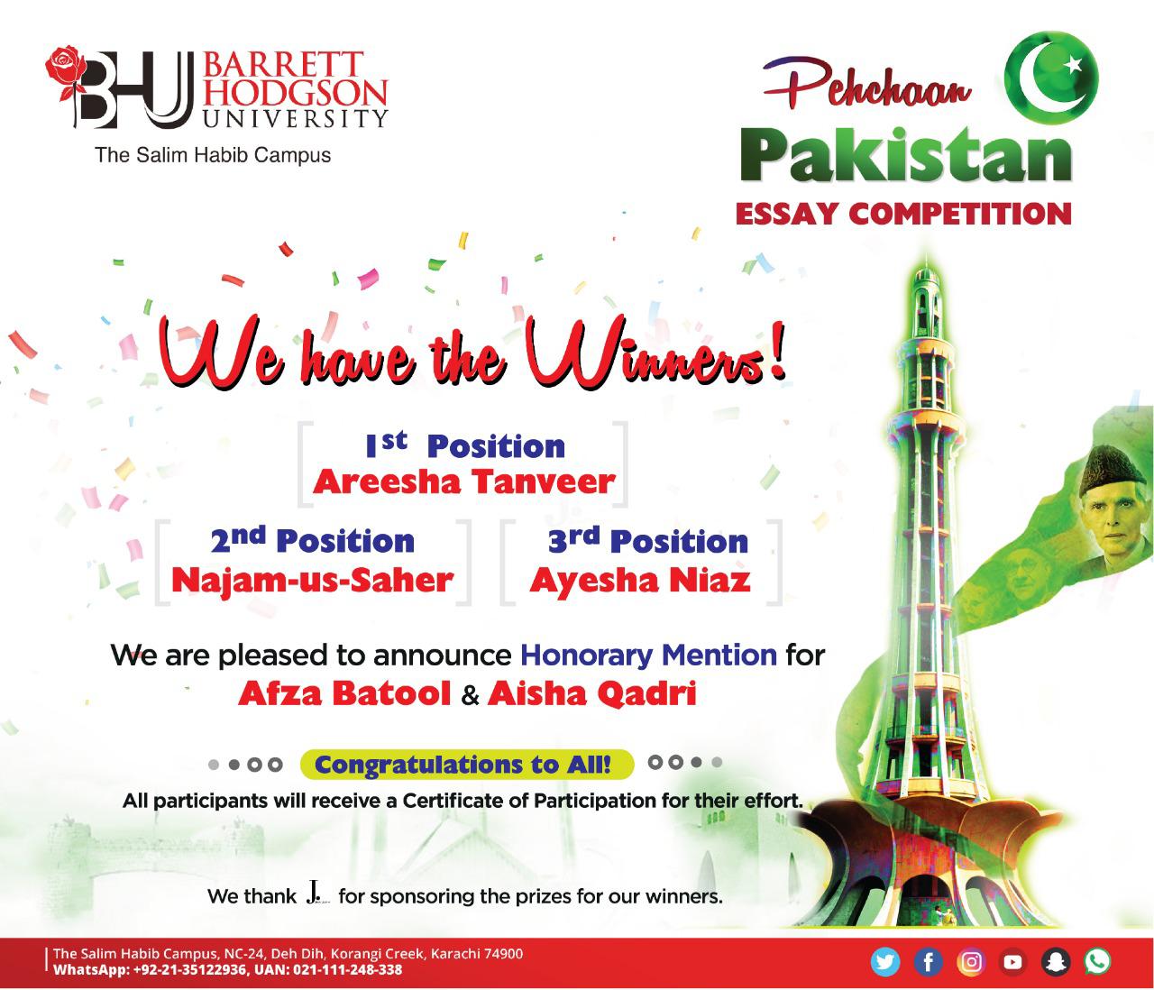 PehchaanPakistan Essay Competition has officially come to an end and we would like to thank all the participants for submitting some very creative content! Here are the #Winners!1. Areesha Tanveer 1st year MBBS, Dow medical College 2. Najam-us-Saher – 11th Grade, Habib Girls Higher Secondary School 3. Ayesha Niaz – MSc Psychology, University of Karachi 4. Afza Batool – Comsats University, Islamabad 5. Aisha Qadri- IBA, working in GSK Congratulations to All!All participants will receive a #Certificate of Participation for their effort.We thank J. for sponsoring the prizes for our winners.#PehchaanPakistan #BHUCompetition #BarrettHodgsonUniversity #PakistanDay #23rdMarch