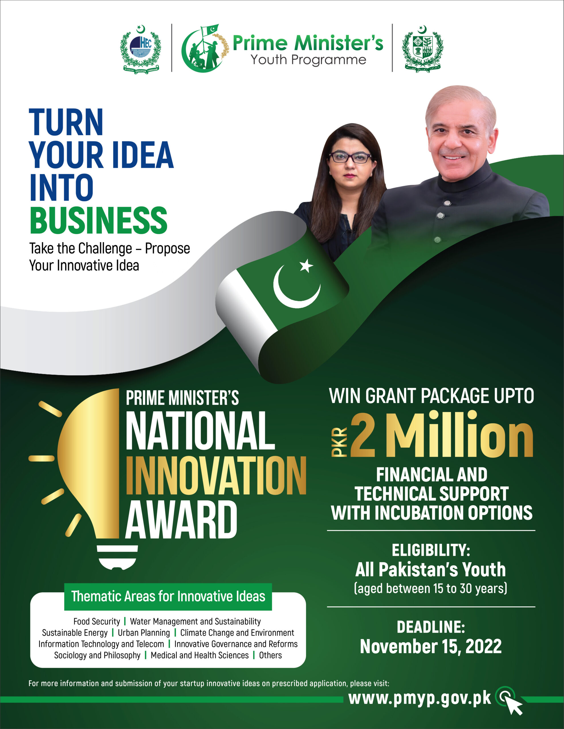 TURN YOUR IDEA INTO A BUSINESSThe Prime Minister's Youth Programme is giving you the perfect opportunity to turn your great idea into a business!Take the challenge, propose your innovative idea, and get the chance to win a grant up to Rs. 2 million under the Prime Minister's National Innovation Award. To submit your idea, fill in the application at www.pmyp.gov.pk.Deadline for submission: November 15, 2022 Note:*All Pakistanis within the age bracket of 15-30 years are eligible to compete*The grant will cover financial and technical support with incubation options for your idea
