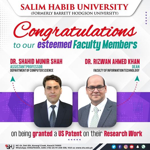 Join us in giving our heartiest congratulations to SHU Computer Science Faculty Members Dr. Shahid Munir Shah, Assistant Professor, Department of Computer Science, and Dr. Rizwan Ahmed Khan, Dean, Faculty of Information Technology, whose collaborative research work has resulted in a US patent.This is a huge honor, as USA patents, applicable when research matures and can be commercialized, fall under some of the most prestigious and most secure intellectual property protection laws across the globe, and the US patent granting process is one of the most rigorous patenting processes.Details of the granted US patent are given below:Title: Dialect Based Speaker IdentificationPatent Number: 11348591Application Number: 17/482639Patent Publication Date: 05/31/2022Patent Webpage: https://www.freepatentsonline.com/11348591.htmlThe process of patent filing is painstaking, and this achievement is extremely remarkable. We commend Dr. Shahid and Dr. Rizwan for both their research work (that has been granted the patent) that took almost three years, and for undergoing the painstaking procedure of patent application filing and the process till the grant of it which took another two years.SHU is immensely proud of them!