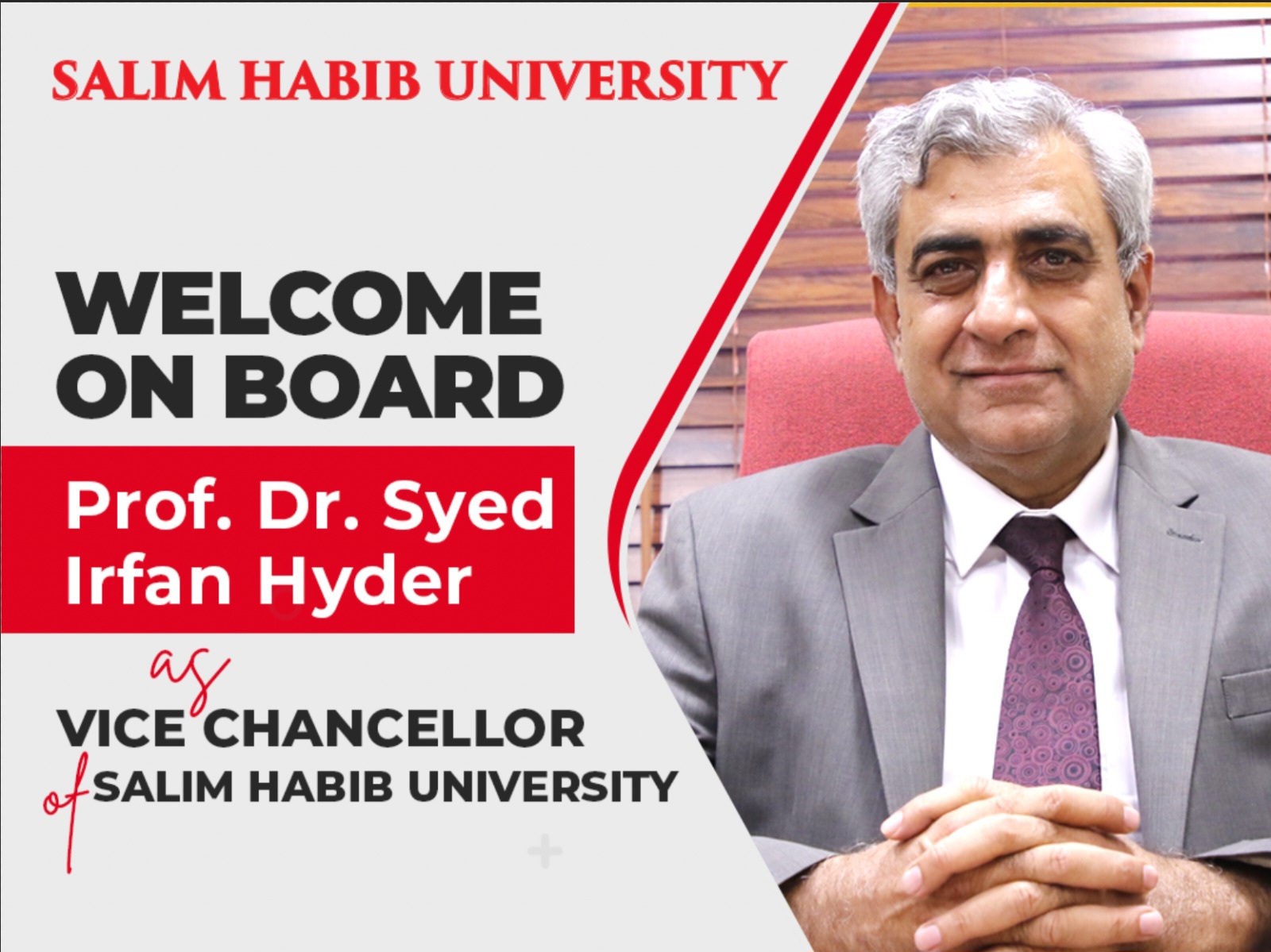 Dr. Iram Afaq, the Chancellor of Salim Habib University, welcomes Prof. Dr. Syed Irfan Hyder on Board as Vice Chancellor.Dr. Irfan Hyder's impressive credentials include an MS and PhD from the University of Texas, Austin, USA, as well as a BE from NED University of Engineering and Technology, Karachi, and an MBA from the Institute of Business Administration (IBA), Karachi.He has rich academic experience with an IT background, having served as IT Consultant, Oxford University Press, Director Software Solutions (Pvt.) Ltd., Deputy Director Computer Studies IBA, Vice President & Dean PAF-KIET, and Rector IoBM. He last served as Vice Chancellor of Ziauddin University. It is an honour to have him with us!