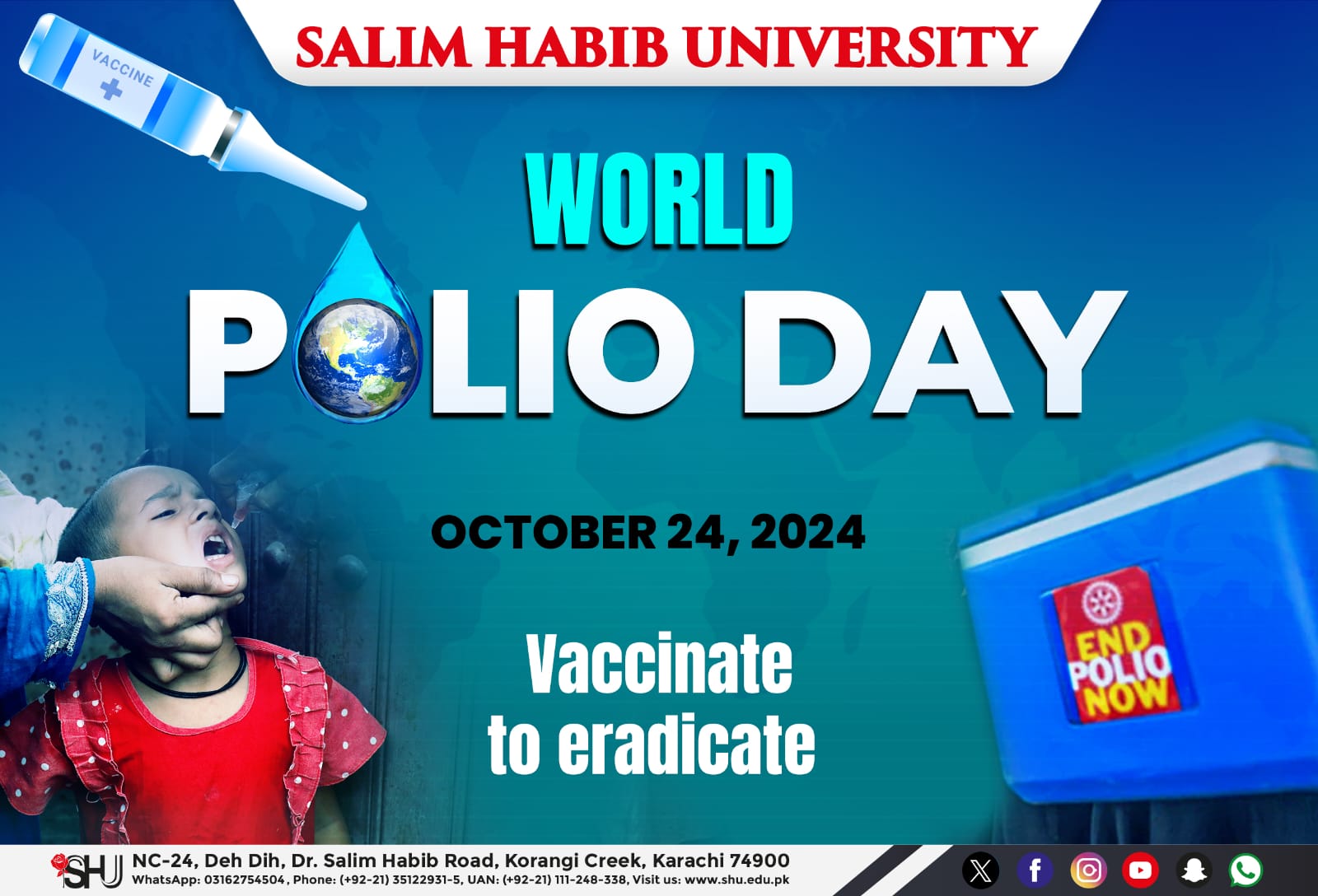World Polio Day, observed annually on October 24 by the World Health Organization (WHO), raises awareness of polio and celebrates the efforts that have been made and are still being made to eradicate it from the world.Polio, an extremely harmful disease that usually affects children under the age of five through the spread of the contagious poliovirus and leads to irreversible paralysis and/or death, can only be stopped via vaccination. This is why World Polio Day is important, as it spreads knowledge regarding polio and its vaccine and thus saves lives.Through effective vaccination, polio is now almost gone from the world!
